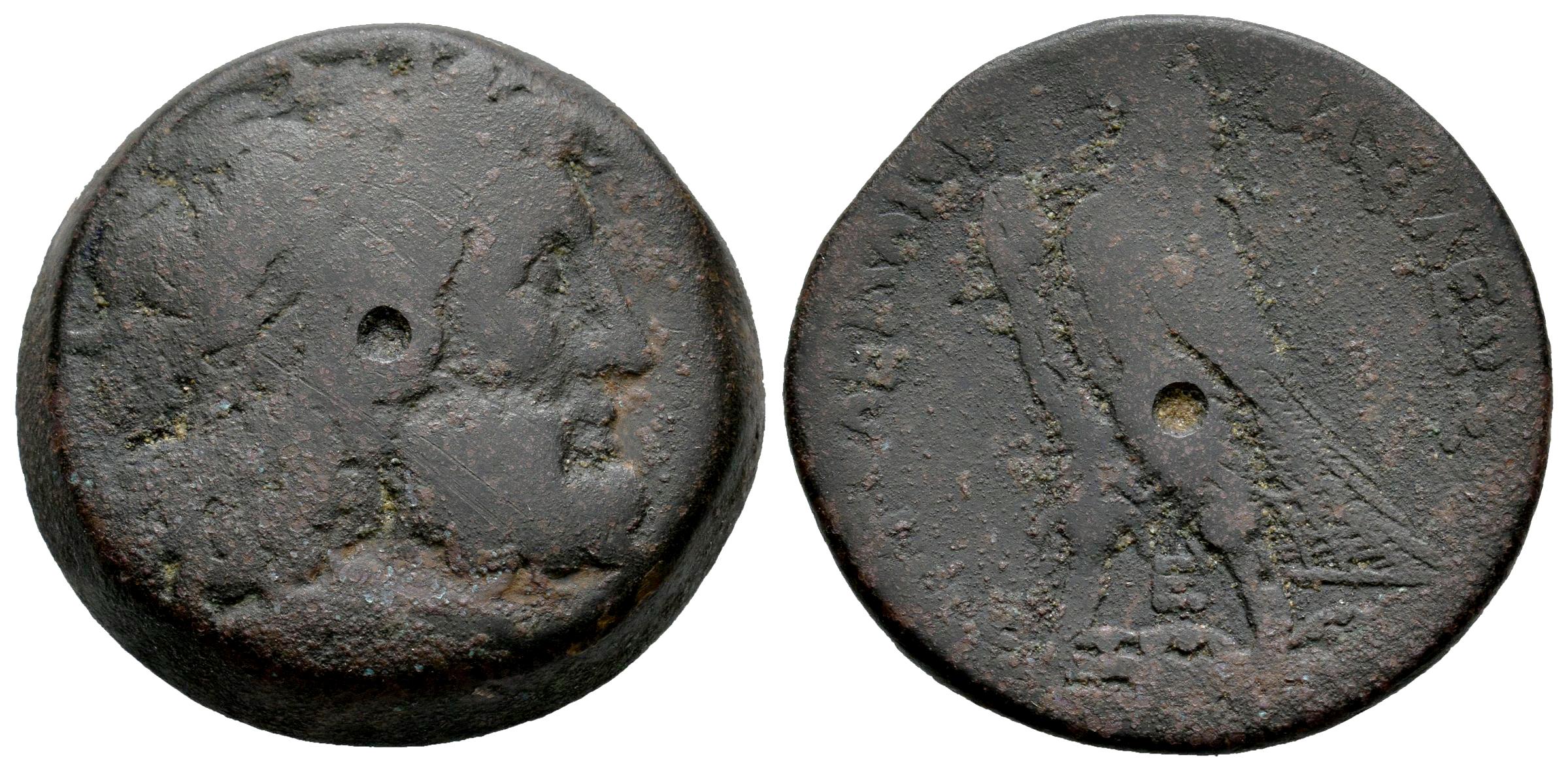 Egipto Ptolemaico. Ptolomeo II Philadelphos. Dióbolo. 260-246 a.C. Alejandría. (Svoronos-449). (CPE-B225a). (Sng Cop-no cita). Anv.: Cabeza laureada de Zeus a derecha. Rev.: ΠΤΟΛΕΜΑΙΟΥ ΒΑΣΙΛΕΩΣ, águila con las alas cerradas en pie hacia la izquierda sobre un rayo; E entre las patas. Ae. 26,35 g. BC. Est...45,00.
