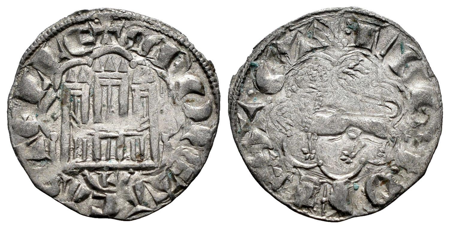 Reino de Castilla y León. Alfonso X (1252-1284). Novén. León. (Bautista-398). Anv.: + MONETA CASTELLE. Rev.: + : ET︙LEGIONIS. Ve. 0,79 g. L bajo el castillo. La leyenda del reverso comienza a las 9 h. Escasa. MBC/MBC-. Est...60,00.
