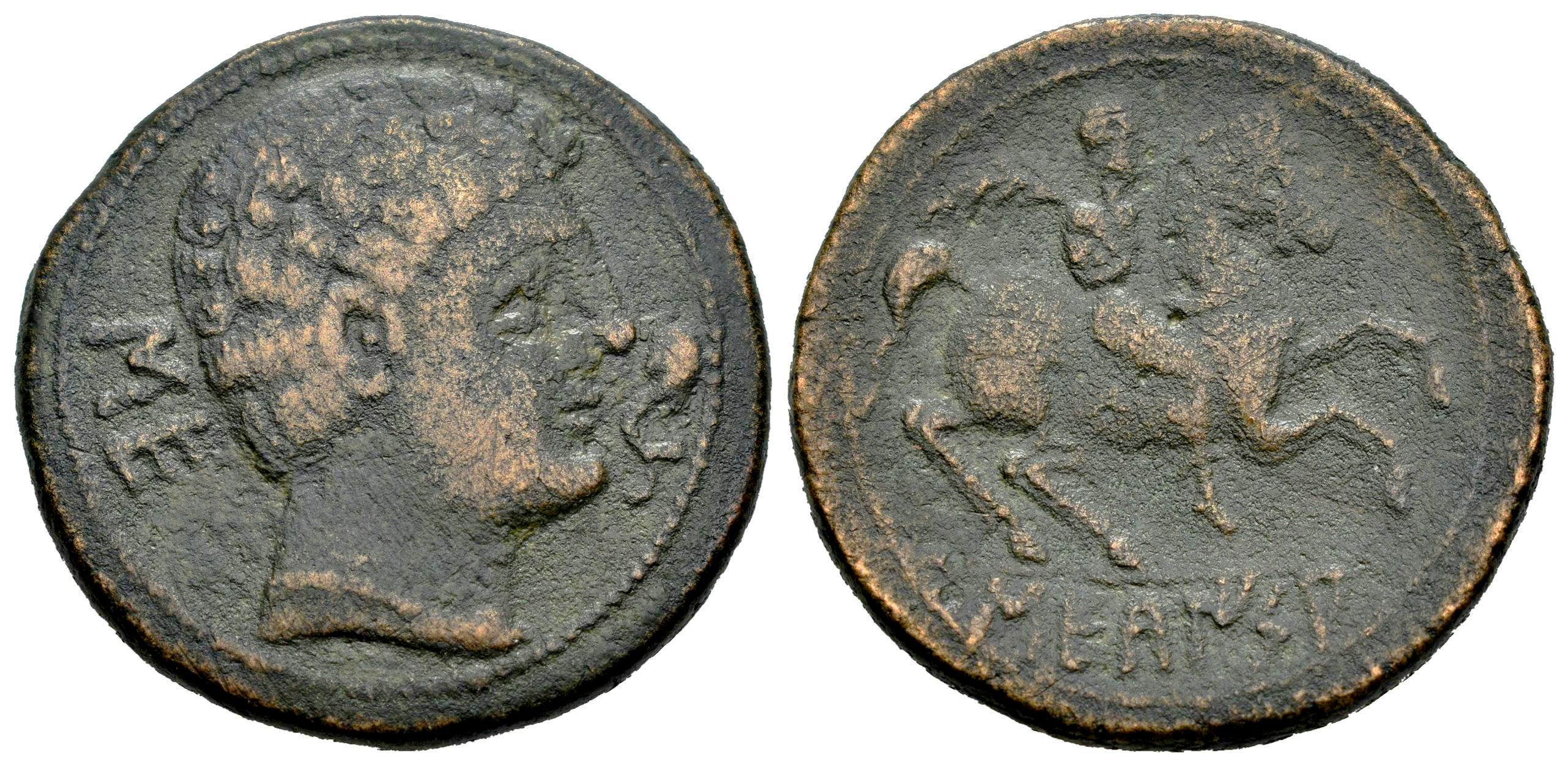 Sekaisa. As. 120-20 a.C. Zona de Aragón. (Abh-2121). (MIB-117/15). (Acip-1544). Anv.: Cabeza masculina a derecha, delante delfín, detrás letras ibéricas SE. Rev.: Jinete con palma a derecha, debajo leyenda ibérica SEKAISA. Ae. 17,32 g. MBC/MBC-. Est...150,00.
