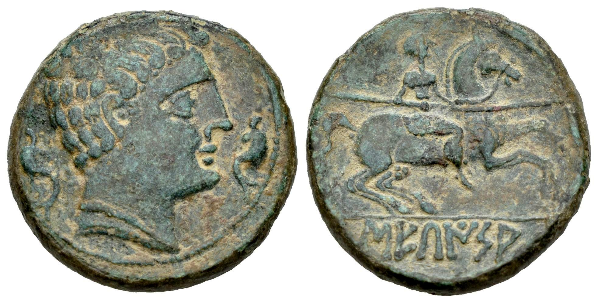 Sekaisa. As. 120-20 a.C. Zona de Aragón. (Abh-2131). (MIB-117/24d). (Acip-1560). Anv.: Cabeza masculina a derecha, entre dos delfines. Rev.: Jinete con lanza a derecha, debajo de línea leyenda ibérica SEKAISA. Ae. 9,57 g. MBC. Est...120,00.