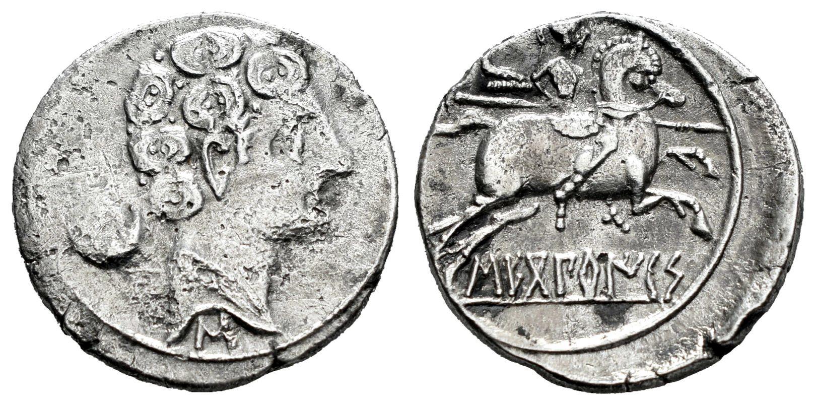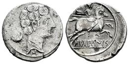Sekobirikes. Denario. 120-30 a.C. Saelices (Cuenca). (Abh-2174). (Acip-1875). Anv.: Cabeza masculina a derecha, detrás creciente y debajo letra ibérica S. Rev.: Jinete con clámide a derecha asomando dos pies, debajo leyenda ibérica SEKOBIRIKES. Ag. 3,47 g. Oxidaciones limpiadas. MBC/MBC+. Est...90,00.