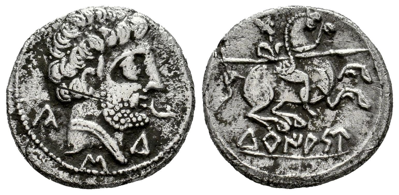 Turiasu. Denario. 120-20 a.C. Tarazona (Zaragoza). (Abh-2417). (MIB-109/23a). Anv.: Cabeza barbada a derecha, letra ibérica KA, S y TU. Rev.: Jinete con lanza a derecha, con las patas traseras del caballo encogidas, debajo leyenda ibérica TURIASU. Ag. 3,64 g. Antojadiza forma de ¿creciente? delante del busto. Conocemos otros ejemplares del mismo cuño que presentan dicha marca (Véase MIB 148219 y 12495). Raya en anverso. Metal algo poroso. MBC-/MBC. Est...120,00.
