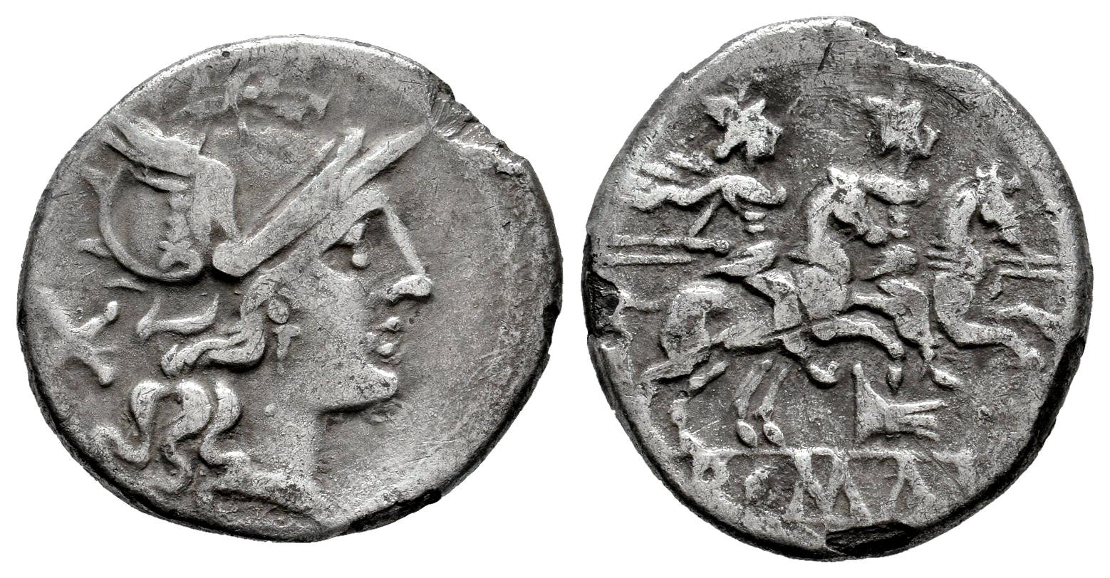 Anónimo. Denario. 200-190 a.C. Roma. (Ffc-51). (Craw-114/1). (Cal-5). Anv.: Cabeza de Roma a derecha, detrás: X. Rev.: Los Dioscuros a caballo a derecha, encima: estrellas, debajo: proa de nave, en el exergo: ROMA, en tablilla. Ag. 3,73 g. Golpes en el canto. MBC-. Est...75,00.