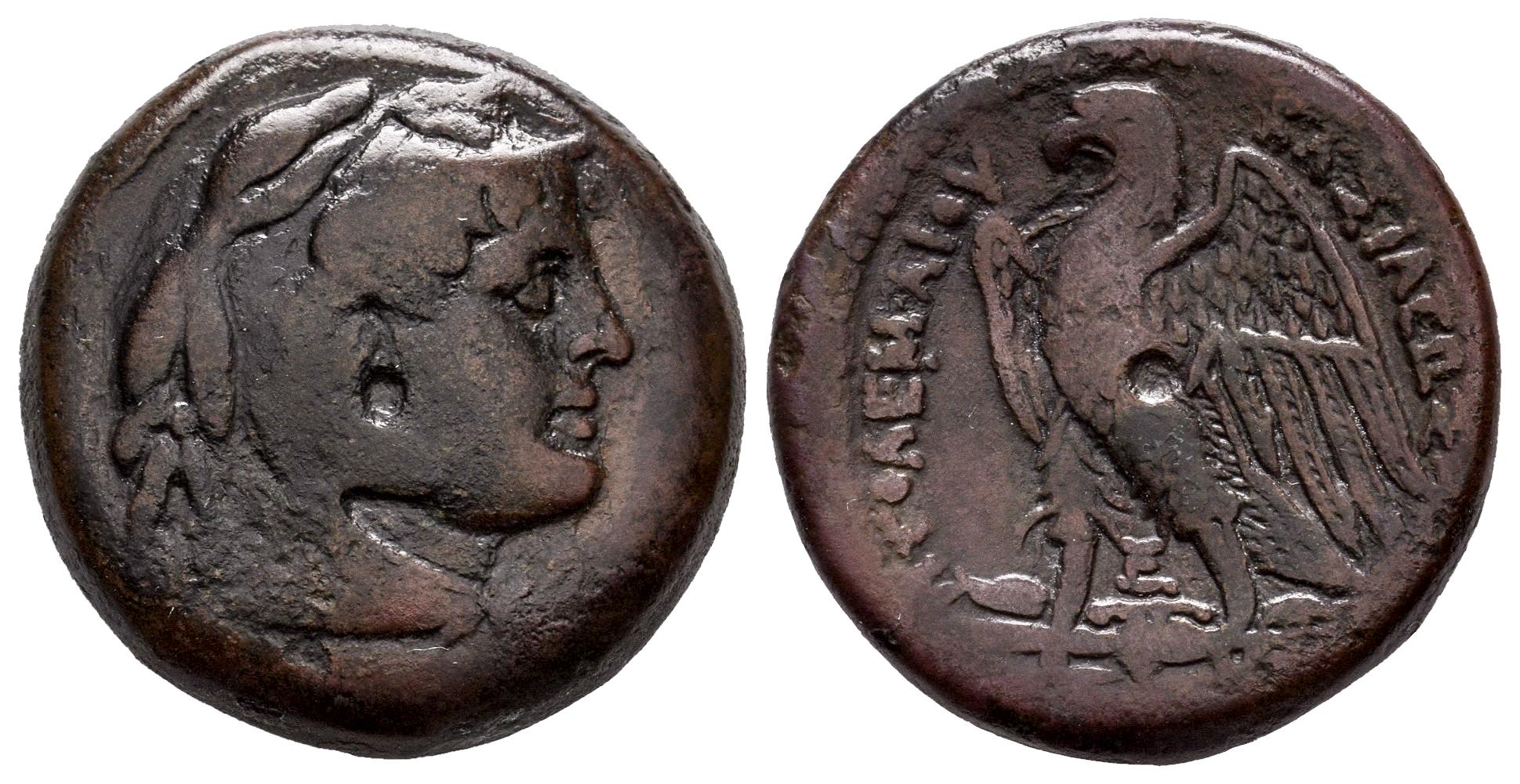 Egipto Ptolemaico. Ptolomeo II Philadelphos. Óbolo. 285-246 a.C. Alejandría. (Svoronos-450). (CPE-B226a). Anv.: Cabeza de Alejandro a la derecha, con tocado de piel de elefante. Rev.: Águila en pie a la izquierda sobre un rayo, con las alas extendidas; E entre las patas. Ae. 9,23 g. BC+. Est...35,00.