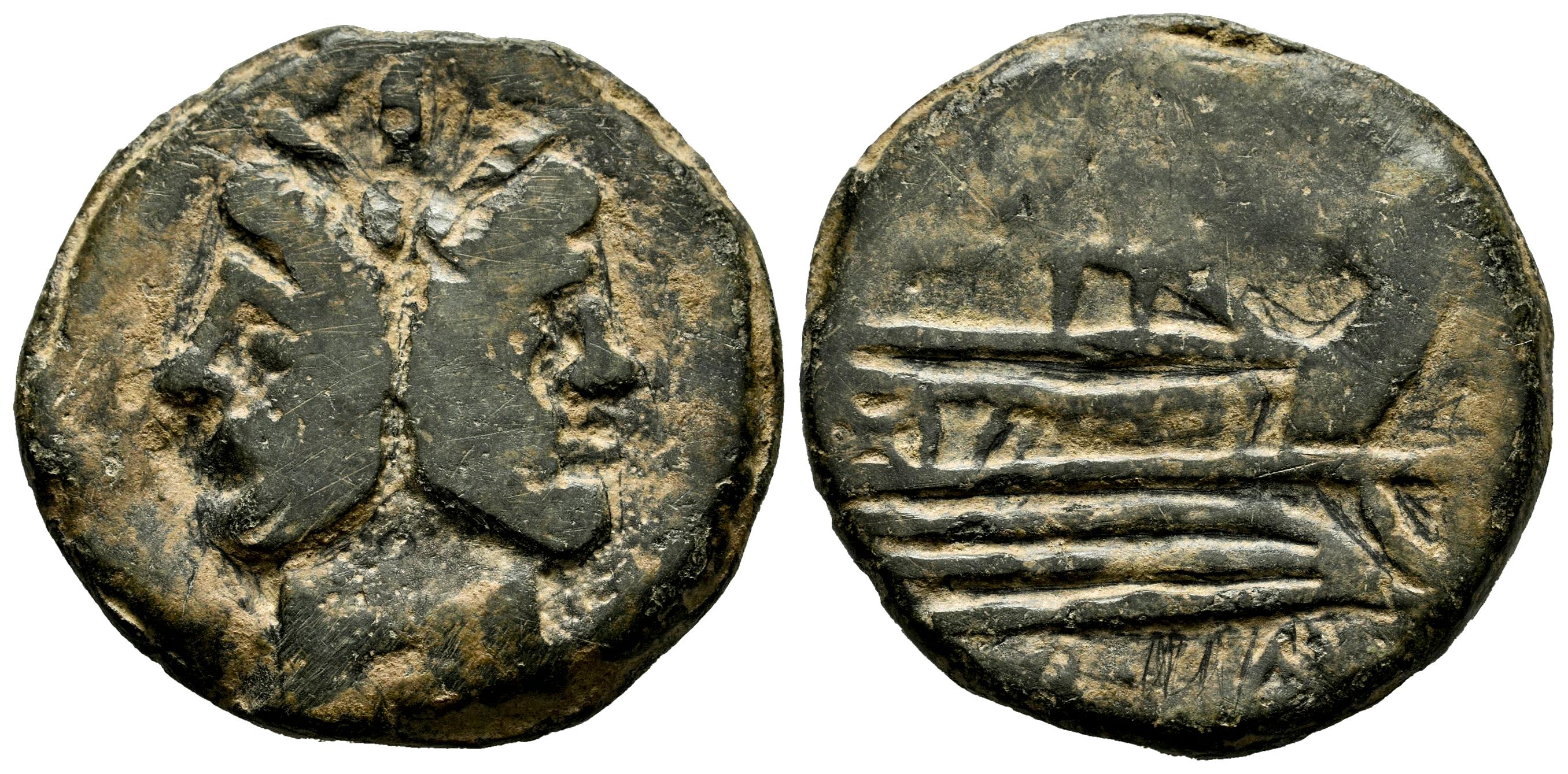 Anónimo. As. 211 a.C. Roma. (Craw-56/2). (Sydenham-143). (BMCRR-Rome 217). Anv.: Cabeza laureada de Jano; I (marca de valor) arriba. Rev.: Proa de galera a la derecha; I (marca de valor) arriba, ROMA abajo. Ae. 23,38 g. MBC-. Est...70,00.