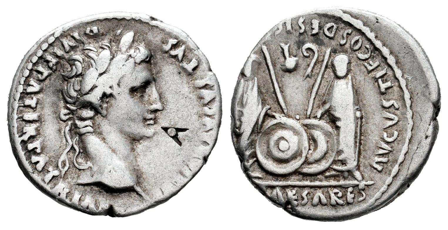Augusto. Denario. 7-6 a.C. Lugdunum. (Ric-I 207). (Bmcre-519ff). (Rsc-43). Anv.: CAESAR AVGVSTVS DIVI F PATER PATRIAE. Cabeza laureada a derecha. Rev.: AVGVSTI F COS DESIG (PRINC IVVENT). Cayo y Lucio César en pie de frente, apoyando las manos sobre escudos colocados entre ellos, con lanza detrás de cada escudo; arriba, a la izquierda, simpulum a derecha y, a derecha lituus hacia izquierda; (C L C)AESARES en exergo. Ag. 3,82 g. Marca de banquero en anverso. MBC. Est...180,00.