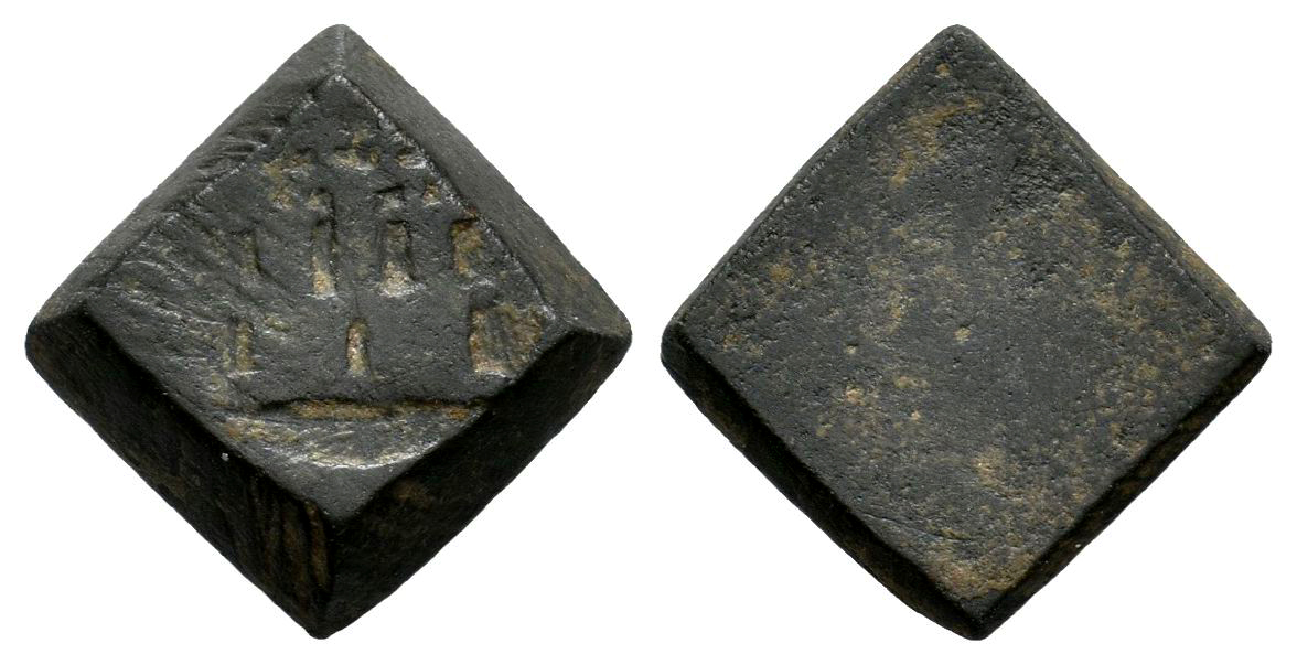 Reino de Castilla y León. Ponderal para 1/2 castellano. (Braña-3.4.1 var.). Anv.: Castillo en relieve. Ae. 2,25 g. 11mm X 11mm. Muy raro. MBC. Est...60,00.