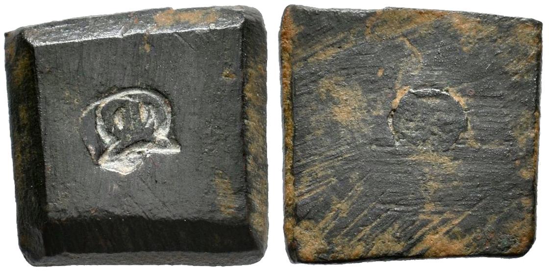 Reino de Castilla y León. Ponderal. Murcia. (Braña-No cita). Anv.: Marca punzonada de M gótica. Ae. 3,42 g. 13mm X 13mm. Esta marca es el mismo punzón utilizado para resellar los Cuartillos y Blancas de Rombo de Enrique IV (Imperatrix C.M.1/4), realizados entre 1474 y 1498. Muy raro. MBC+. Est...120,00.