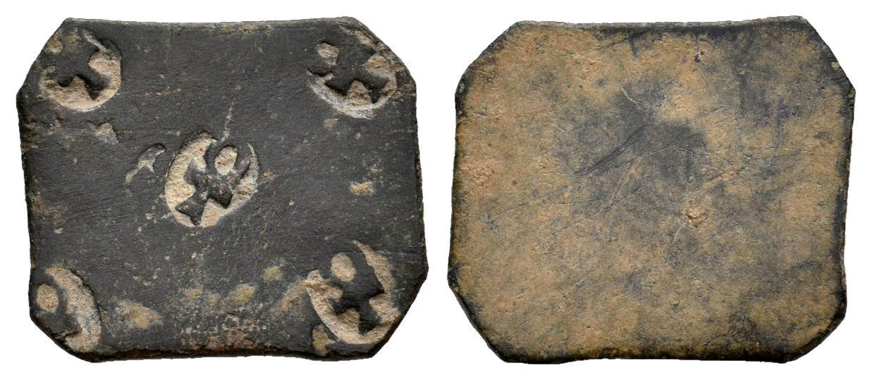 Ponderal. Siglo XVII. (Braña-No cita). Anv.: Cinco punzones ovalados con T superada de roel. Braña cita un punzón similar sonre otro formato (Pag. 54, H). Ae. 0,88 g. 14mm X 12mm. Raro. MBC. Est...70,00.