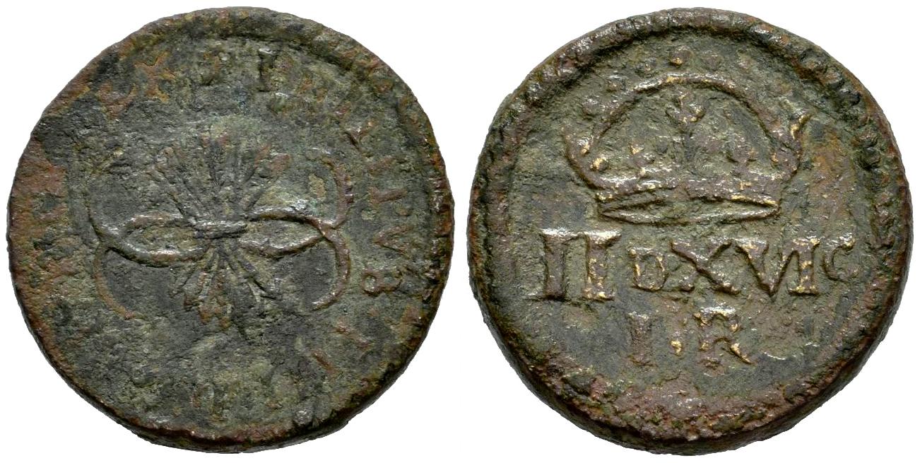 Felipe IV (1621-1665). Ponderal para 1 Real. (Mateu y Llopis-47 var.). Anv.: + PHILIPPVS·IIII· D:G·HISP·REX. Flechas. Rev.: IIdXVIg / I·R bajo corona. Ae. 3,16 g. 28mm. Raro. BC/BC+. Est...50,00.
