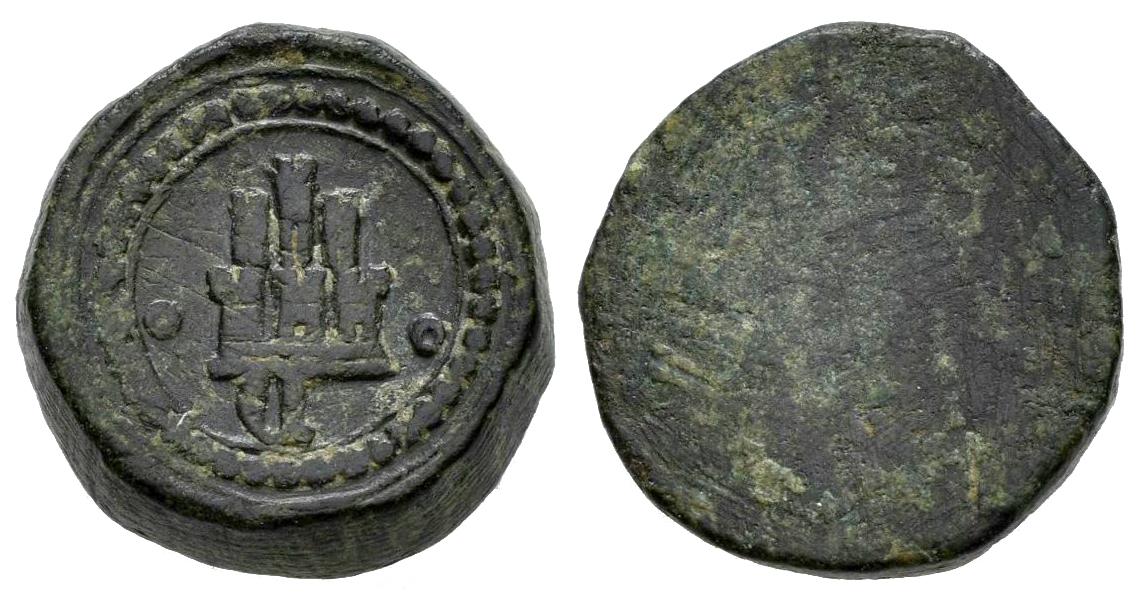 Ponderal de castellano según Ordenamiento de 1488. C gótica debajo del castillo y roeles a los lados. (Braña, numisma 260-A3). 12 mm. 4,43g. Ae. MBC+. Est...75,00.
