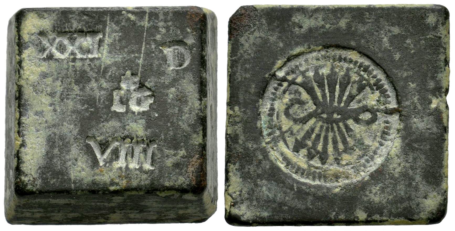 Ponderal para 8 reales. (Braña-No cita). Anv.: En la parte superior XXI - D, en la inferior VIII, entre ambas IG ¿coronada? o *. Rev.: Flechas. Ae. 26,92 g. 21mm X 21mm. MBC+. Est...45,00.