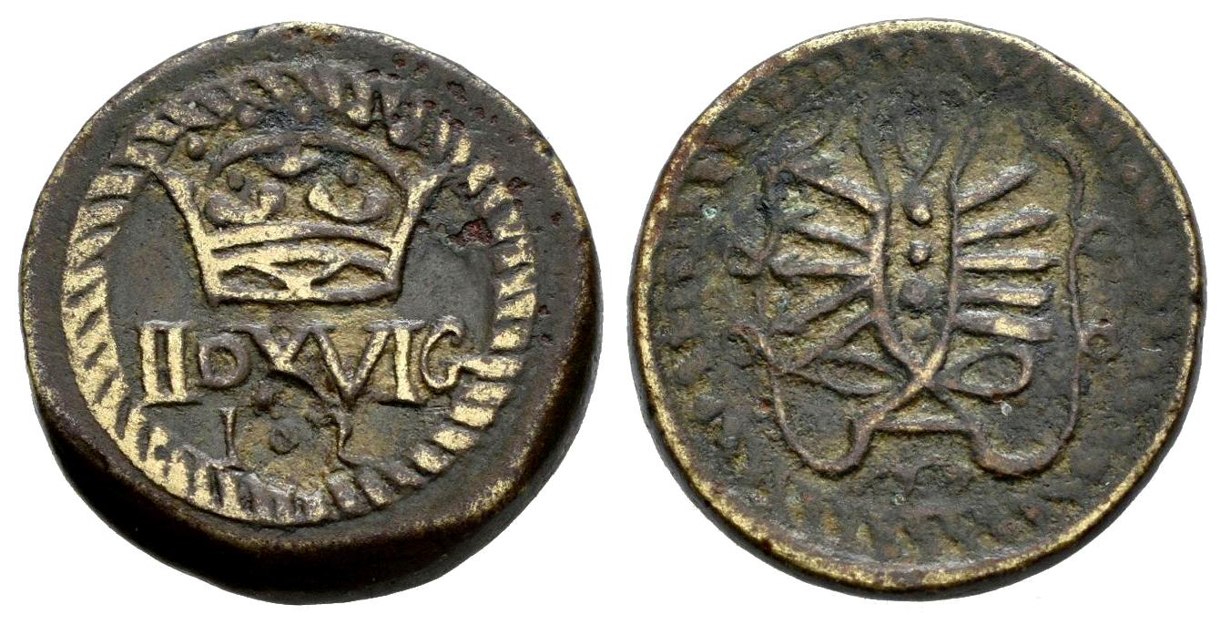 Ponderal para florín, probablemente francés del siglo XVIII. IIDXVIG bajo corona en anverso y haz de 5 flechas en reverso. 16 mm. 3,26g. Ae. MBC. Est...60,00.