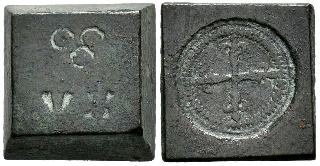 Francia. Ponderal para 3 Deniers. Anv.: Tres roeles / XV. Rev.: Cruz rematada por flores de lis. Ae. 4,73 g. 14mm X 14mm. MBC+. Est...50,00.