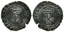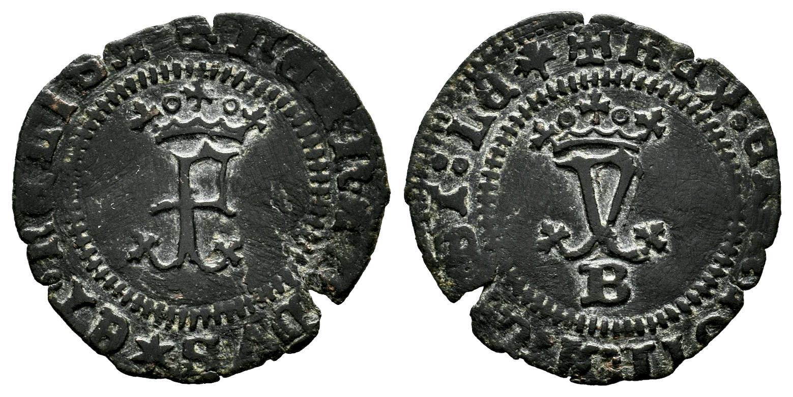 Fernando e Isabel (1474-1504). Blanca. Burgos. (Cal-7). (Bautista-89). Anv.: + FERNANDVS ✶ ET ৹ hELISA ৹ . Rev.: + REX : ET : REGINA : CAST : LE (Perjil). Ae. 0,85 g. MBC+. Est...50,00.