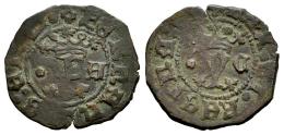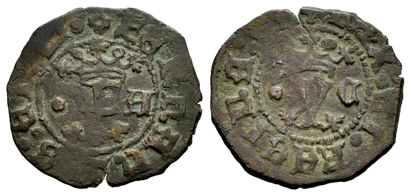 Fernando e Isabel (1474-1504). Blanca. Cuenca. (Cal-21). (Bautista-634 var.). Anv.: F coronada sobre punto y acotada por • - A. FERNADVS : ET : ¿? : . Rev.: Y coronada acotada por • - A. REX : ET : REGINA : CA. Ae. 1,22 g. MBC-. Est...25,00.