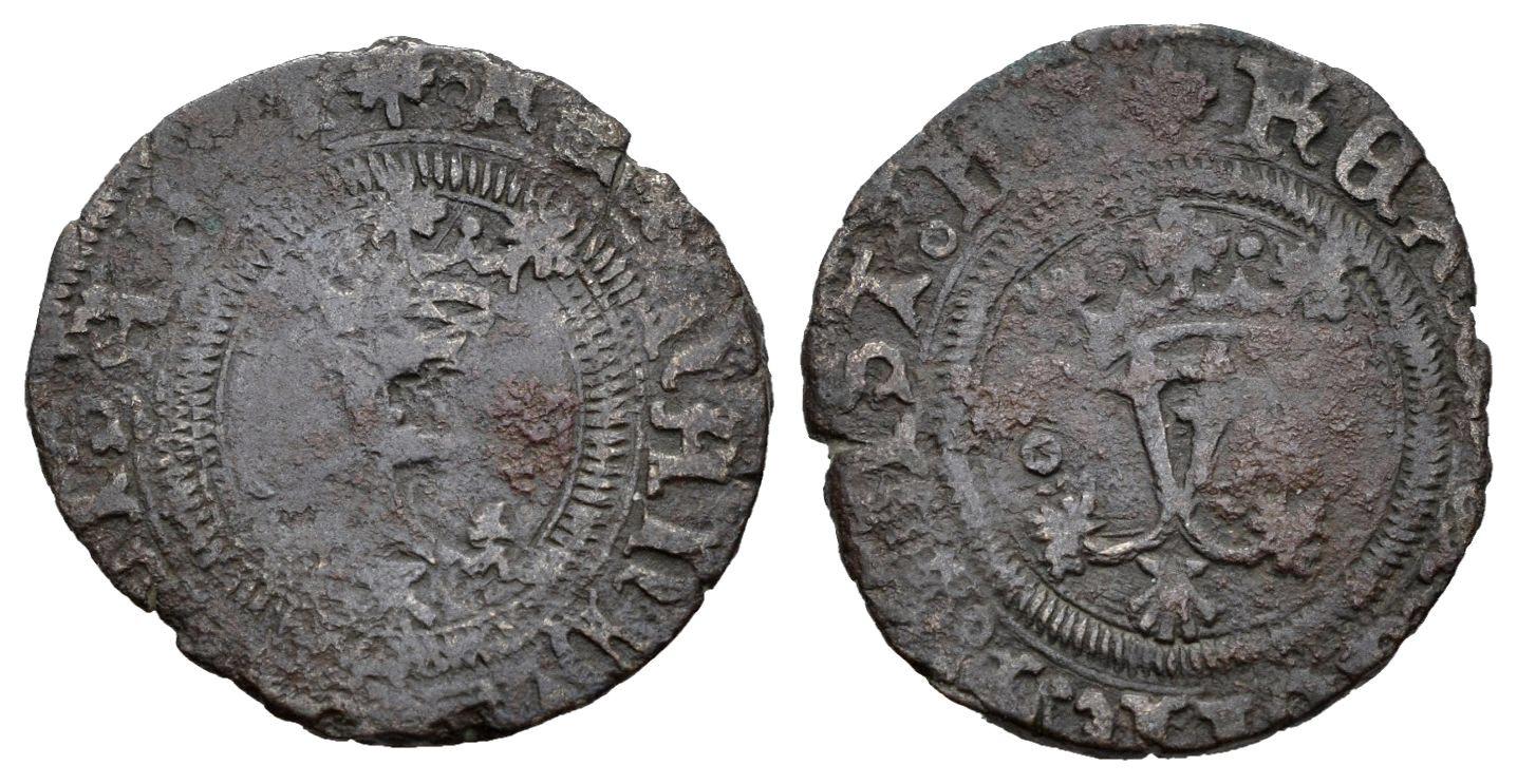 Fernando e Isabel (1474-1504). Blanca. Coruña. (Cal-42). Ae. 1,58 g. Roel a izquierda de Y coronada y venera debajo. BC+. Est...15,00.