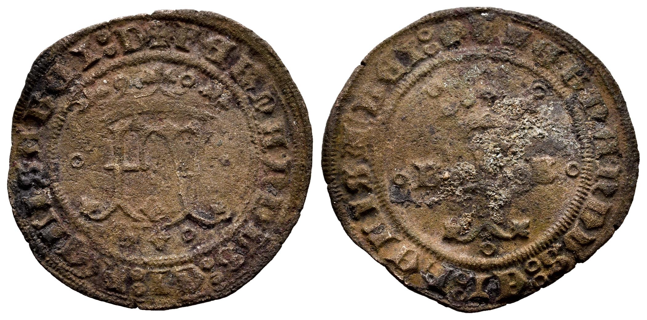 Fernando e Isabel (1474-1504). 2 maravedís. Burgos. Acuñada para circular por Santo Domingo. (Cal-70). Anv.: FY coronadas. + FERNANDVS : ET : HELISABET : D. Rev.: F coronada entre B-B acotadas por roeles. + FERNANDVS : ET : HELISABET : Cabeza de águila. Ae. 2,86 g. Leyenda completas. Algo alabeada. Oxidaciones. Muy rara. MBC. Est...600,00.