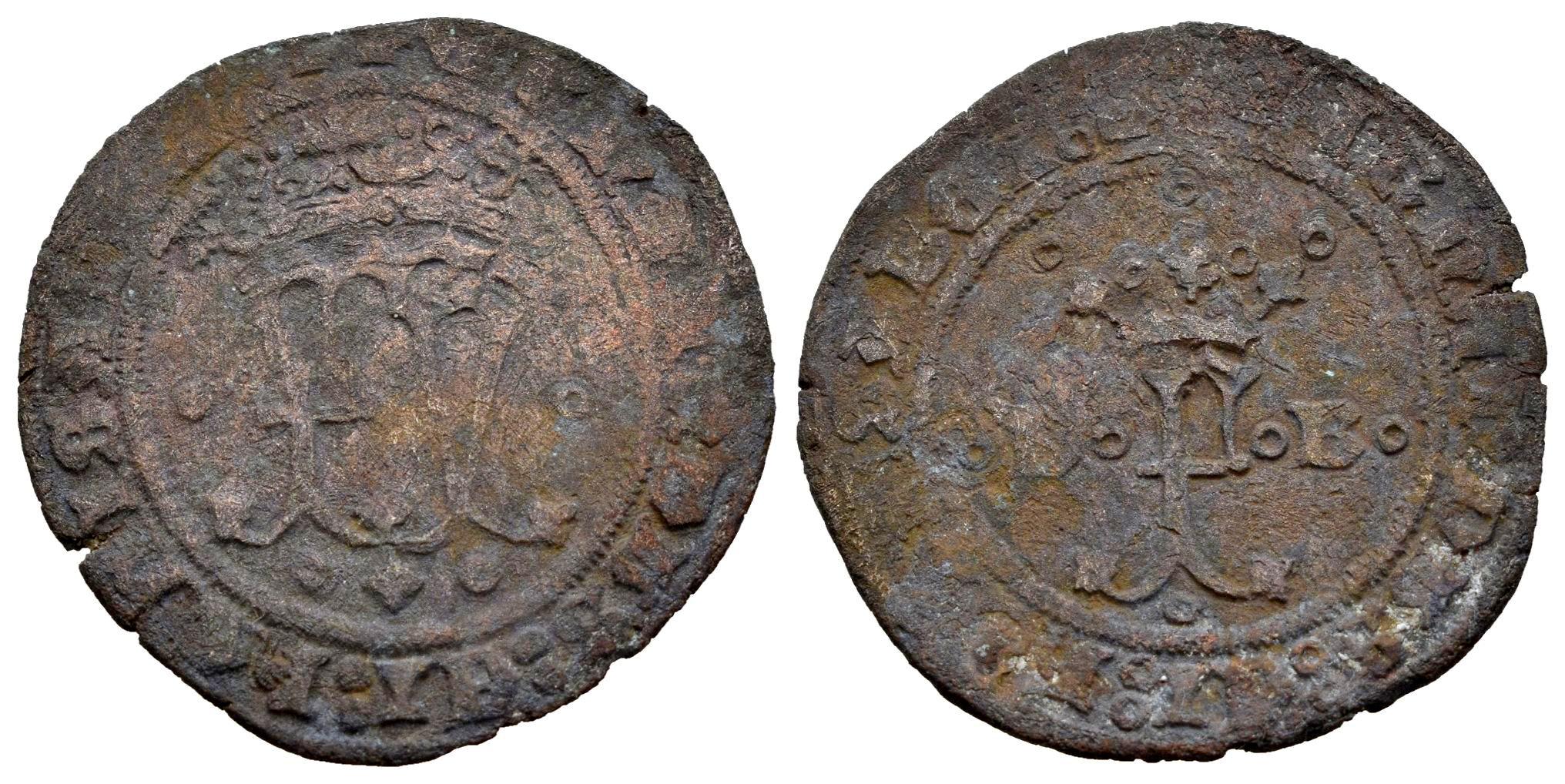 Fernando e Isabel (1474-1504). 2 maravedís. Burgos. Acuñada para circular por Santo Domingo. (Cal-70). Anv.: FY coronadas. + FERNANDVS : ET : hELISABET : D. Rev.: F coronada entre B-B acotadas por roeles. + FERNANDVS : ET : hELISABET : Cabeza de águila. Ae. 3,03 g. Muy rara. BC+. Est...200,00.