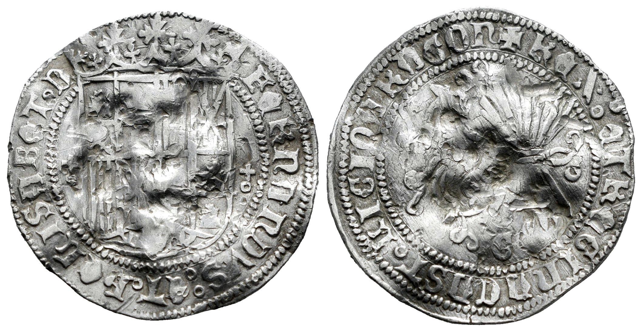 Fernando e Isabel (1474-1504). 1 real. Granada. (Cal-362). Ag. 3,31 g. Escudo entre globos crucíferos. Múltiples golpes. Alabeada. BC+. Est...35,00.
