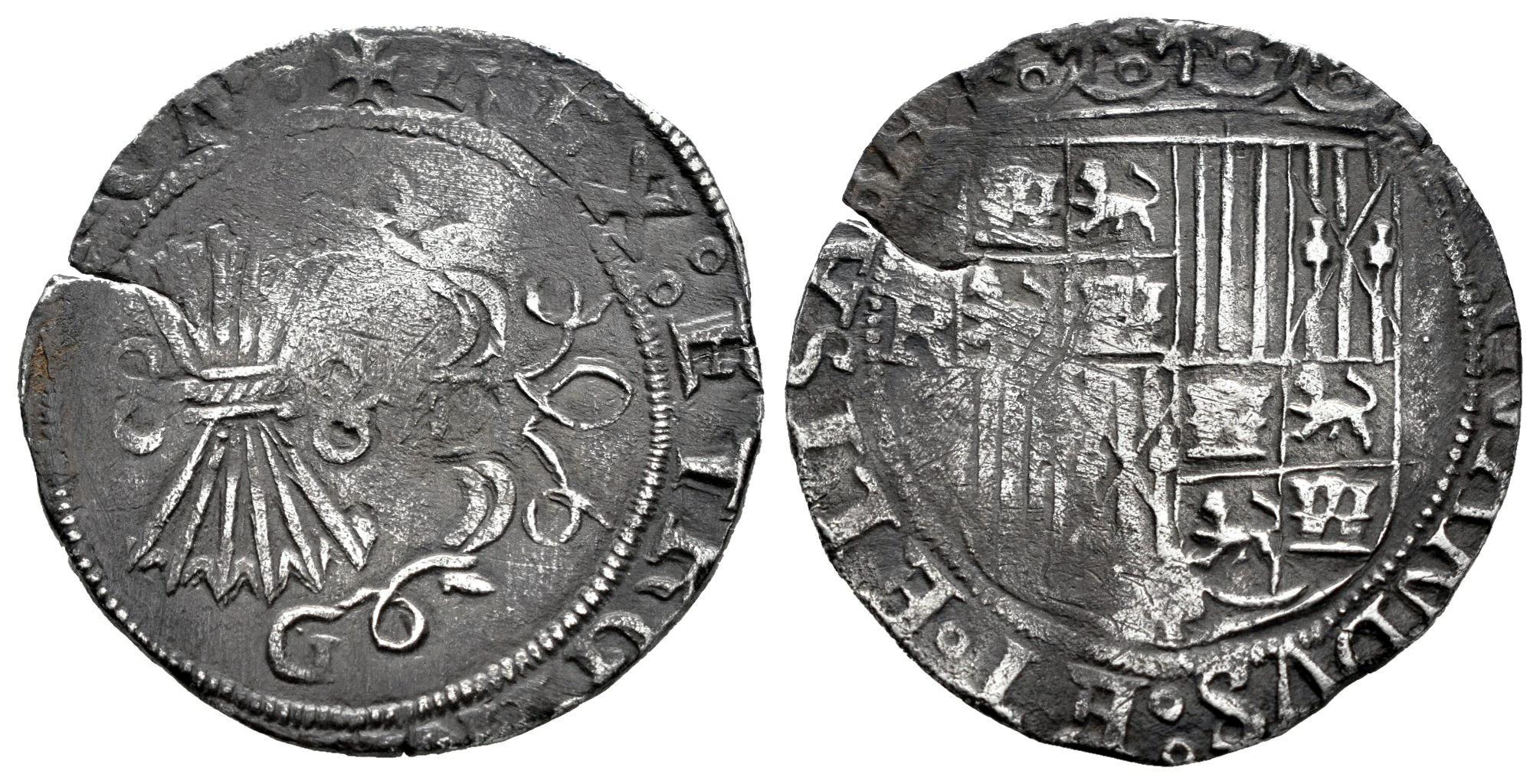 Fernando e Isabel (1474-1504). 1 real. Granada. R. (Cal-375). Ag. 3,10 g. G en reverso. Grieta. MBC-. Est...70,00.