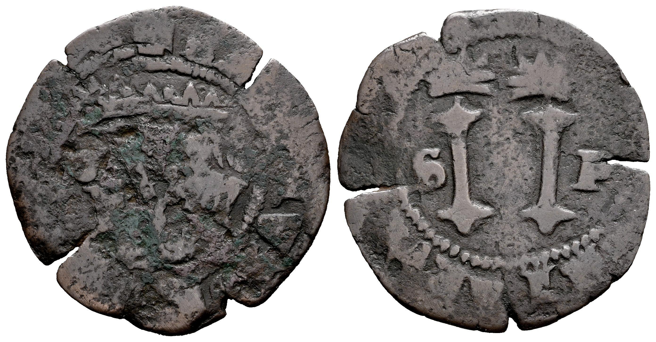 Juana y Carlos (1504-1555). 4 maravedís. ND (1542). Santo Domingo. S-P. (Cal-33). Ae. 2,93 g. Valor IIII. BC/BC+. Est...35,00.