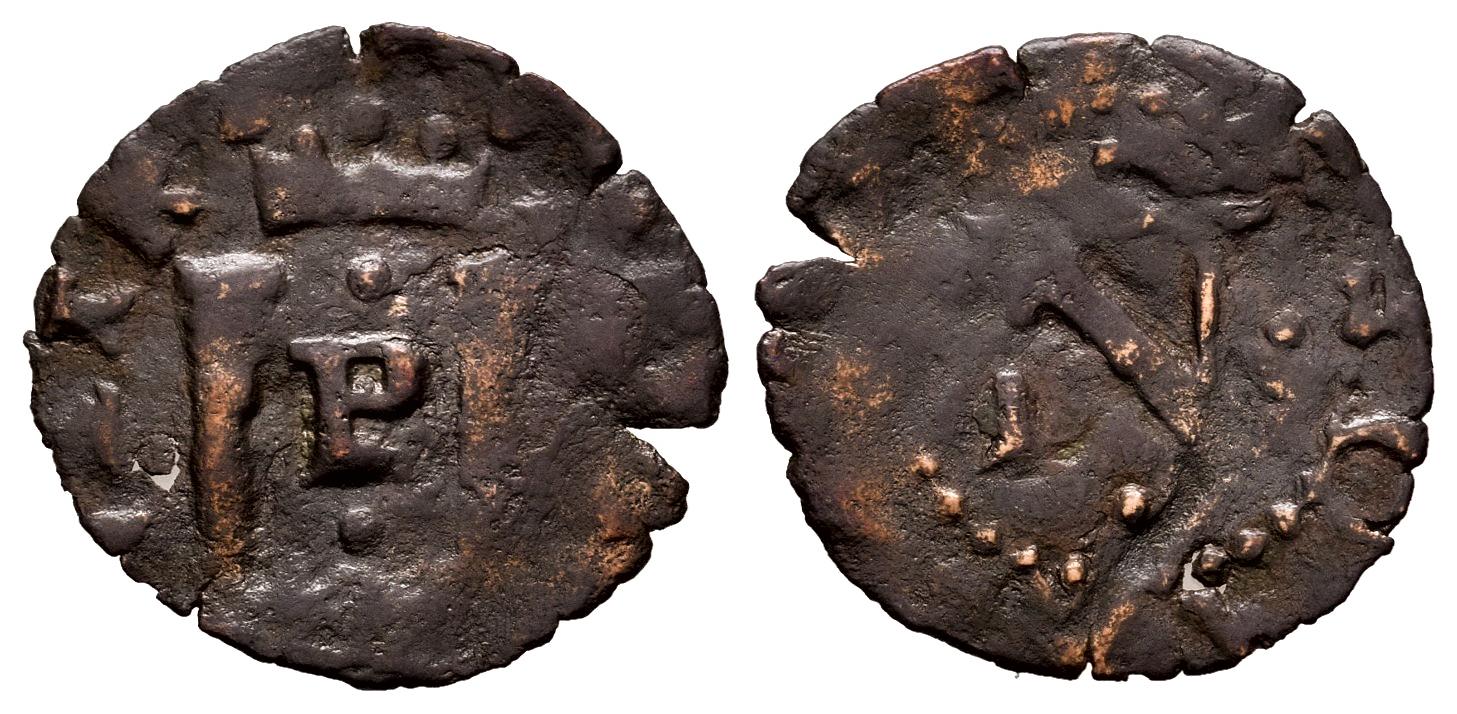 Carlos I (1516-1556). Cornado. Pamplona. (Cal-43). (Ros-4.2.9 var.). Anv.: Columnas de Hércules sobre el mar coronadas, entre ellas P acotada por puntos verticalmente. PLVS - VLTR. Rev.: N entre cuatro puntos. (SIT · NOMEN · DOM). Ae. 0,54 g. MBC-. Est...30,00.