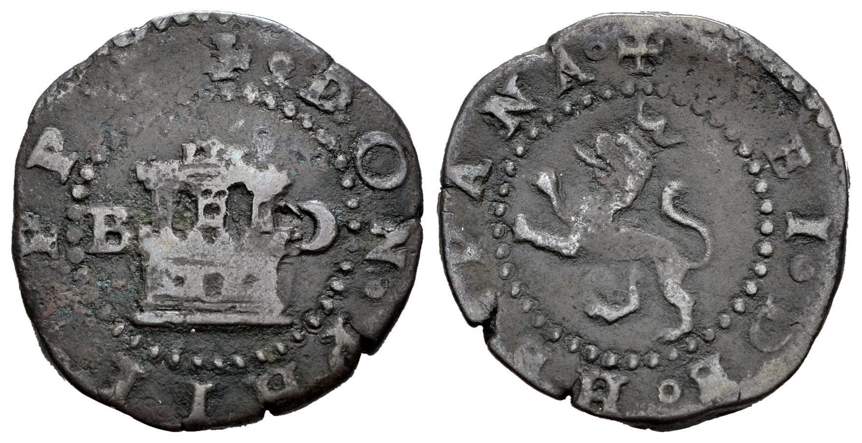 Felipe II (1556-1598). 2 maravedís. ND. Burgos. (Cal-51). (Jarabo-Sanahuja-A18). Ae. 4,03 g. Castillo entre B y creciente. MBC. Est...25,00.