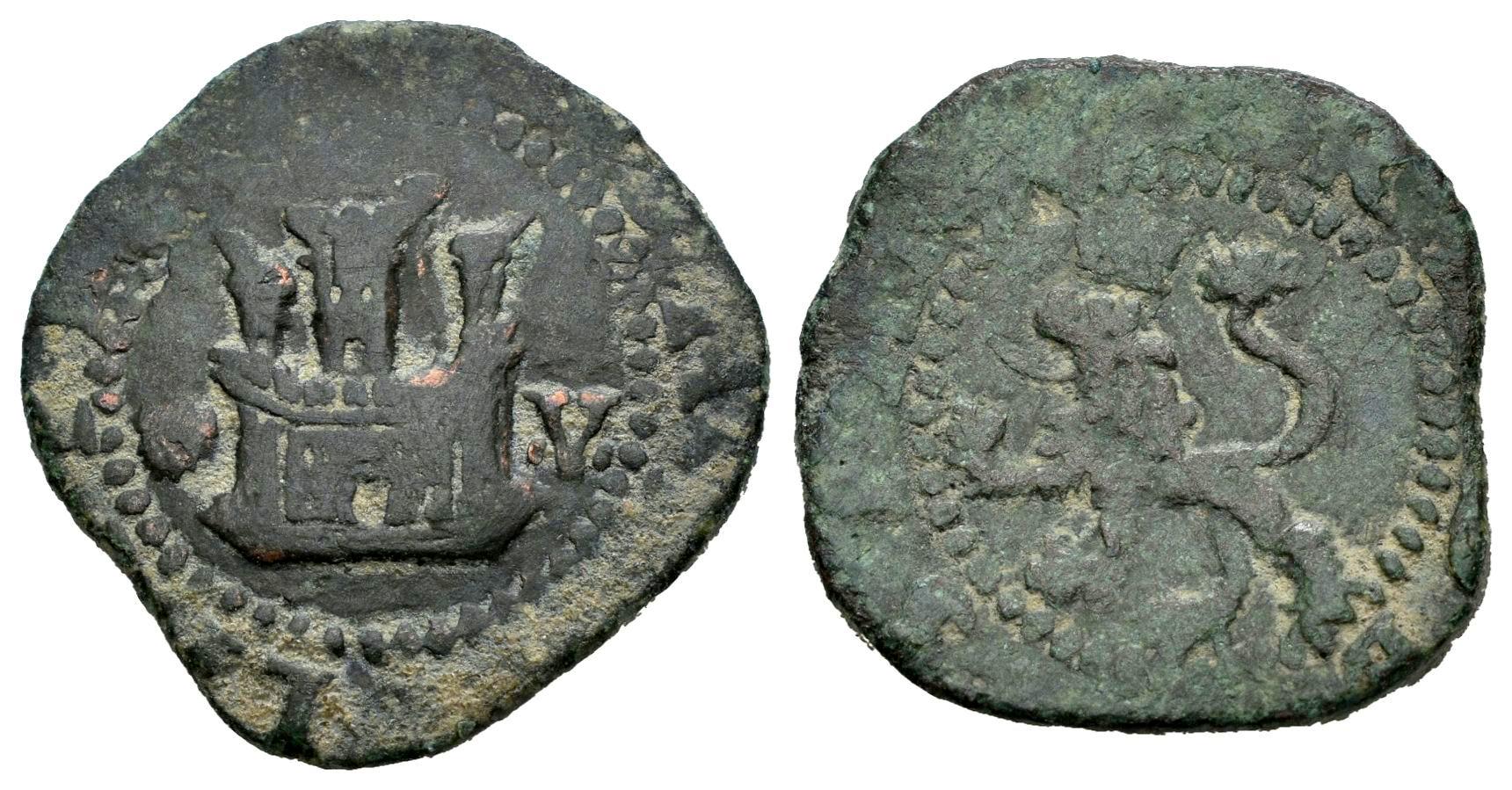 Felipe II (1556-1598). 2 maravedís. ND. Coruña. V. (Cal-A55). (Jarabo-Sanahuja-A55). Ae. 4,42 g. Castillo entre venera y V. MBC-. Est...25,00.