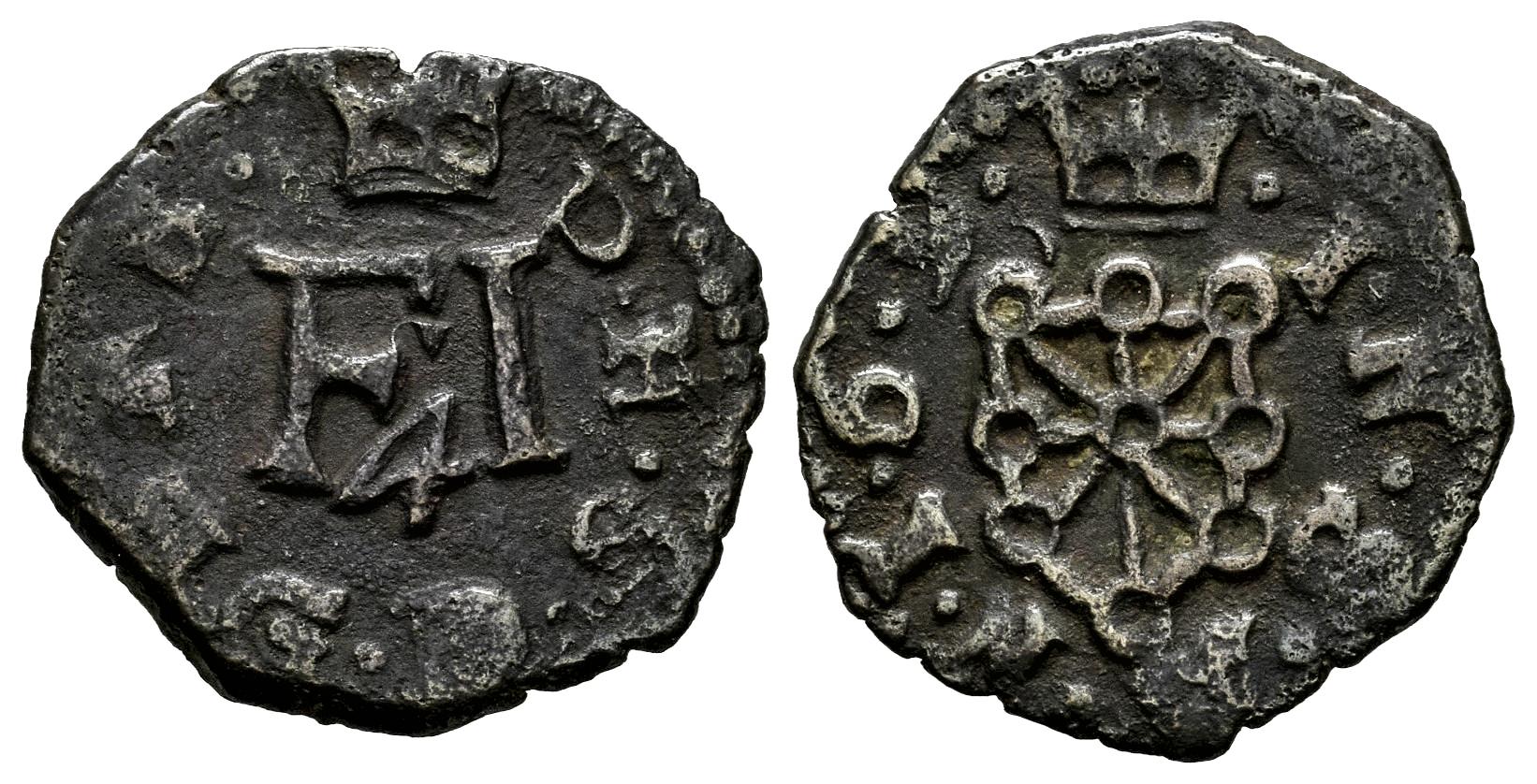Felipe III (1598-1621). 4 cornados. 1609 (I·6·9). Pamplona. (Cal-64 var.). (Ros-No cita). Anv.: · P · H · S · ᗡ · ⅁ · R · N · A · . Rev.: · I · N · S · A · N · I · 6 · 9 · . Ae. 2,59 g. Las D y G del anverso están invertidas. Rara. MBC/MBC+. Est...40,00.