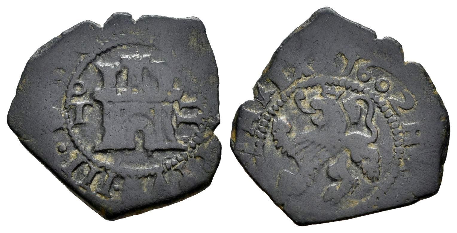 Felipe III (1598-1621). 2 maravedís. 1602. Toledo. (Cal-198). (Jarabo-Sanahuja-D315, mismo ejemplar). Ae. 1,56 g. La leyenda del reverso empieza a las 4h. MBC. Est...25,00.