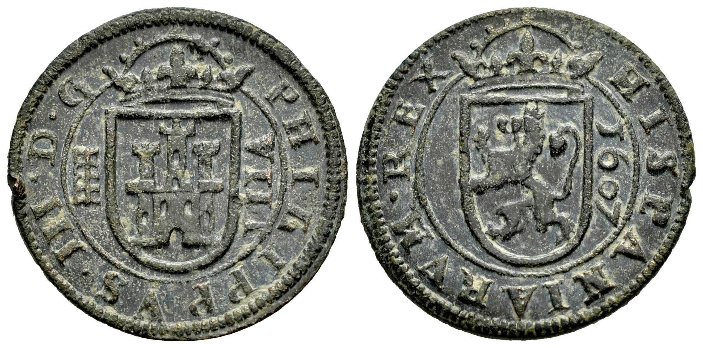 Felipe III (1598-1621). 8 maravedís. 1607. Segovia. (Cal-331). (Jarabo-Sanahuja-D223). Ae. 5,95 g. Acueducto de 4 arcos en 2 pisos. Golpe en el canto. MBC. Est...35,00.
