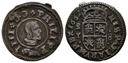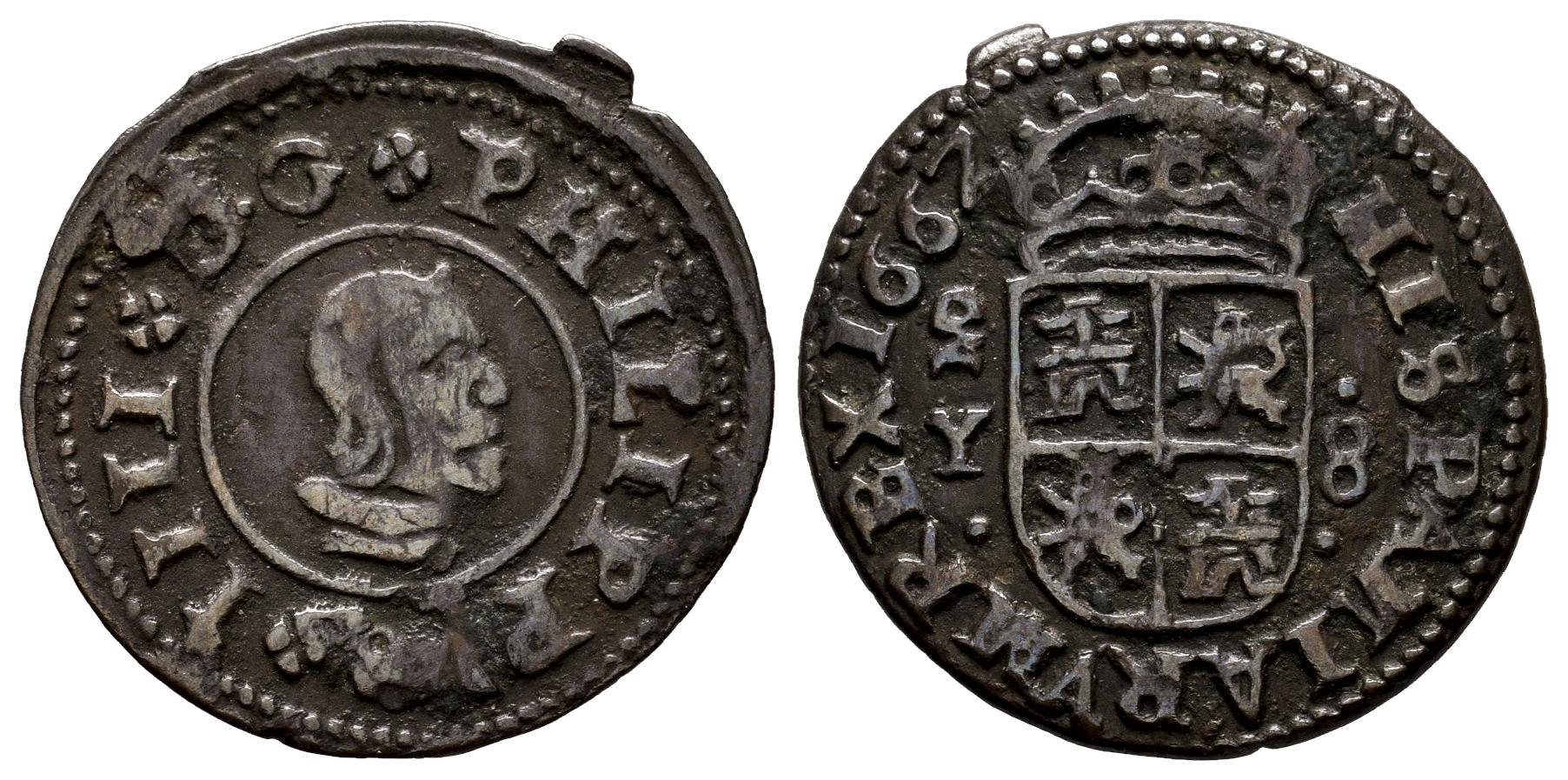 Felipe IV (1621-1665). 8 maravedís. 1662. Madrid. Y. (Cal-364). (Jarabo-Sanahuja-M340). Ae. 2,16 g. Busto propio de la Casa de Molino de la Puerta de Alcalá. Marca de ceca tumbada. Escasa. MBC. Est...40,00.