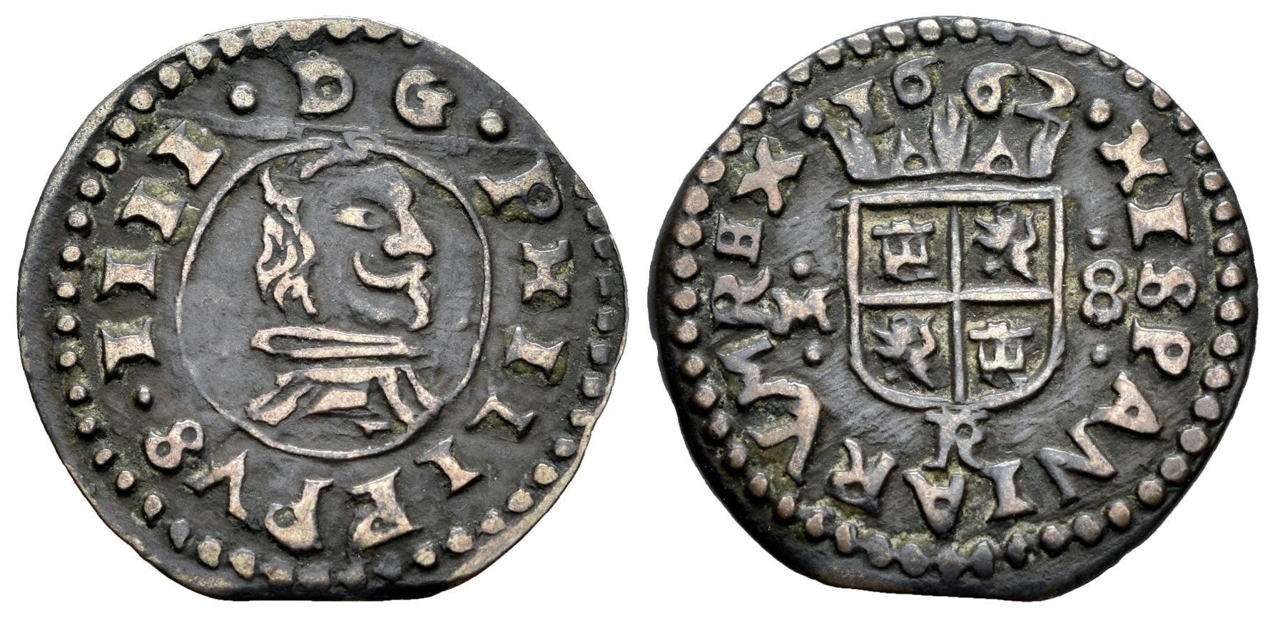 Felipe IV (1621-1665). 8 maravedís. 1662. Trujillo. M. (Cal-428). (Jarabo-Sanahuja-M731). Ae. 1,67 g. Ceca debajo del escudo. MBC+. Est...30,00.