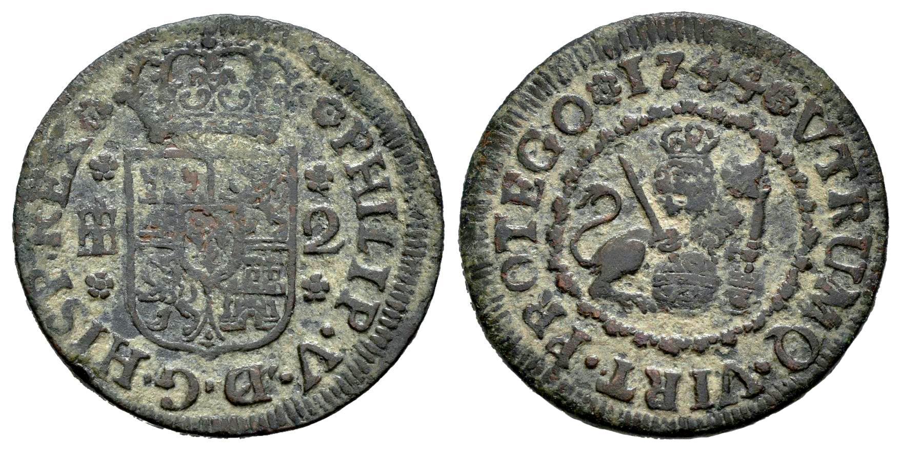 Felipe V (1700-1746). 2 maravedís. 1744. Segovia. (Cal-73). Ae. 3,89 g. MBC. Est...25,00.