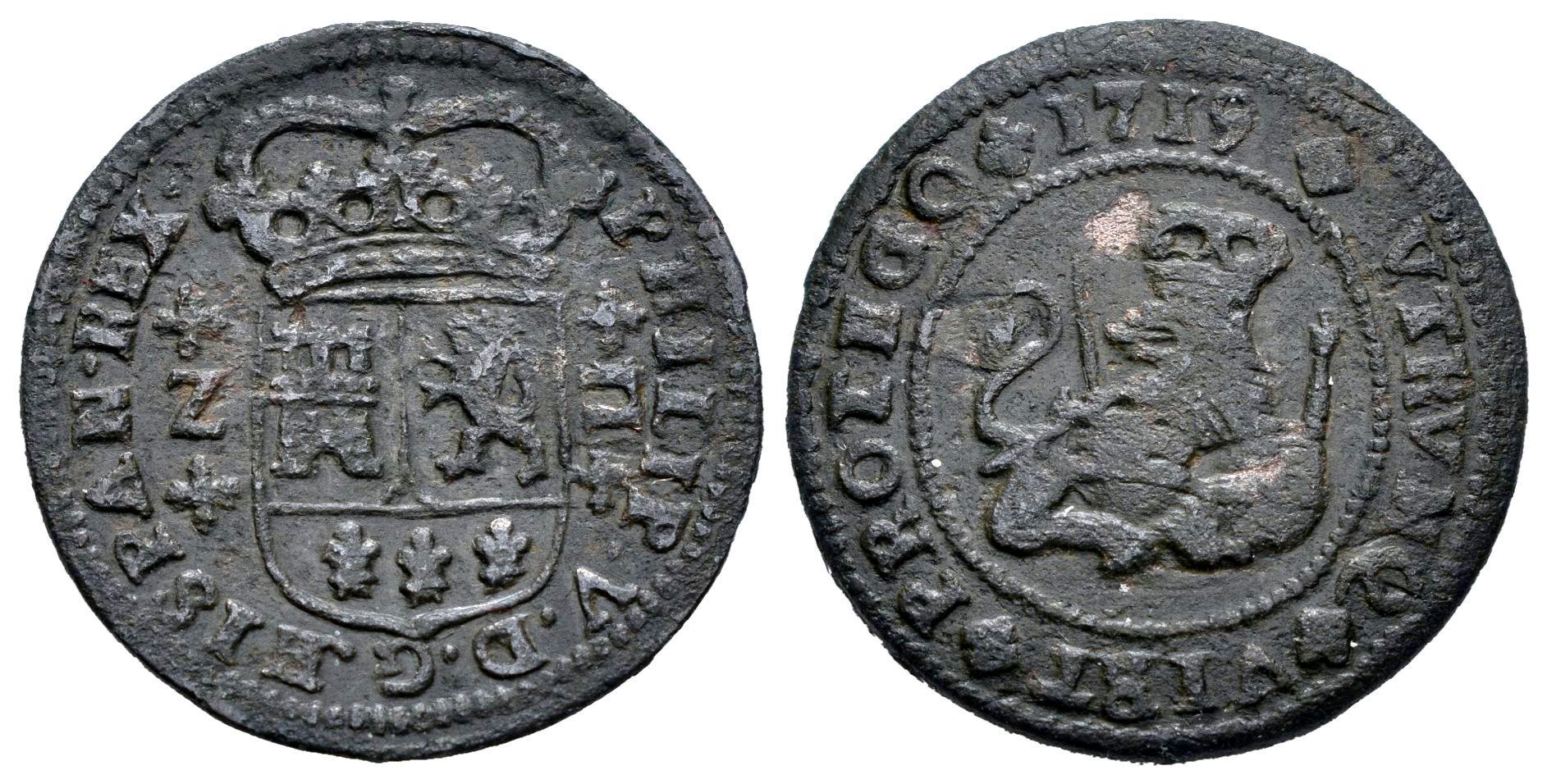 Felipe V (1700-1746). 2 maravedís. 1719. Zaragoza. (Cal-80). Ae. 4,22 g. MBC. Est...30,00.