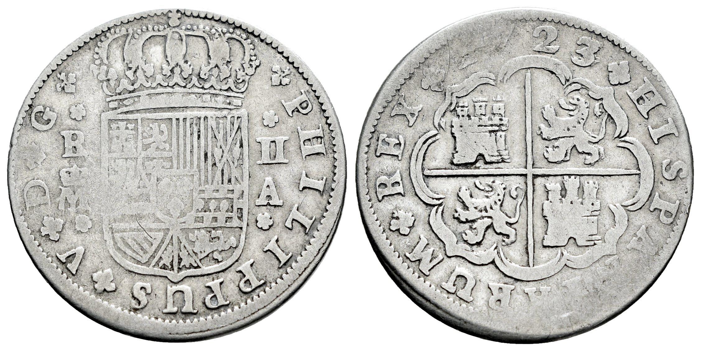 Felipe V (1700-1746). 2 reales. 1723. Madrid. A. (Cal-777). Ag. 4,86 g. BC+. Est...25,00.