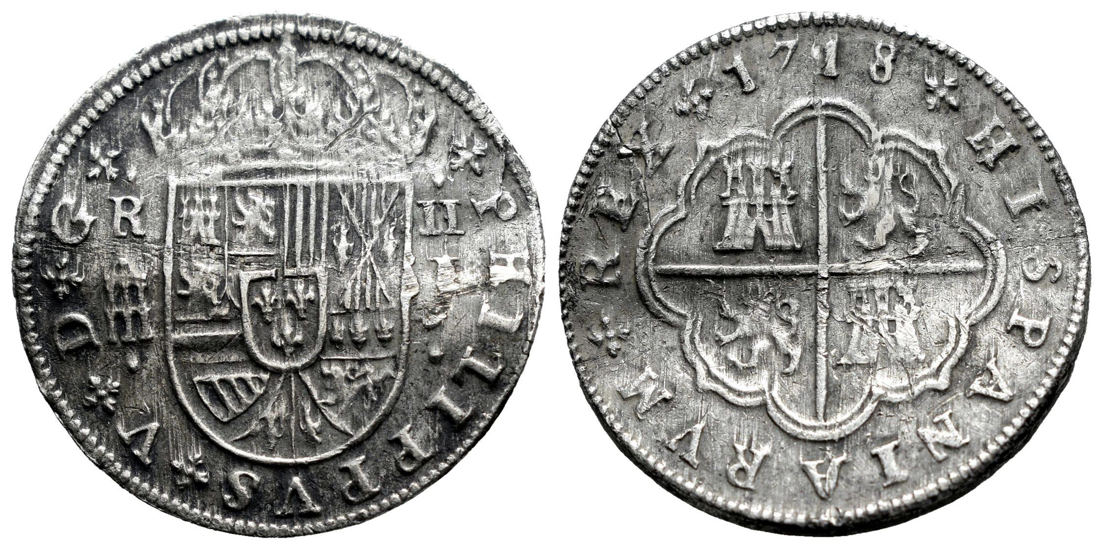 Felipe V (1700-1746). 2 reales. 1718. Segovia. J. (Cal-947). Ag. 6,11 g. Grieta. Doblada. MBC-. Est...30,00.