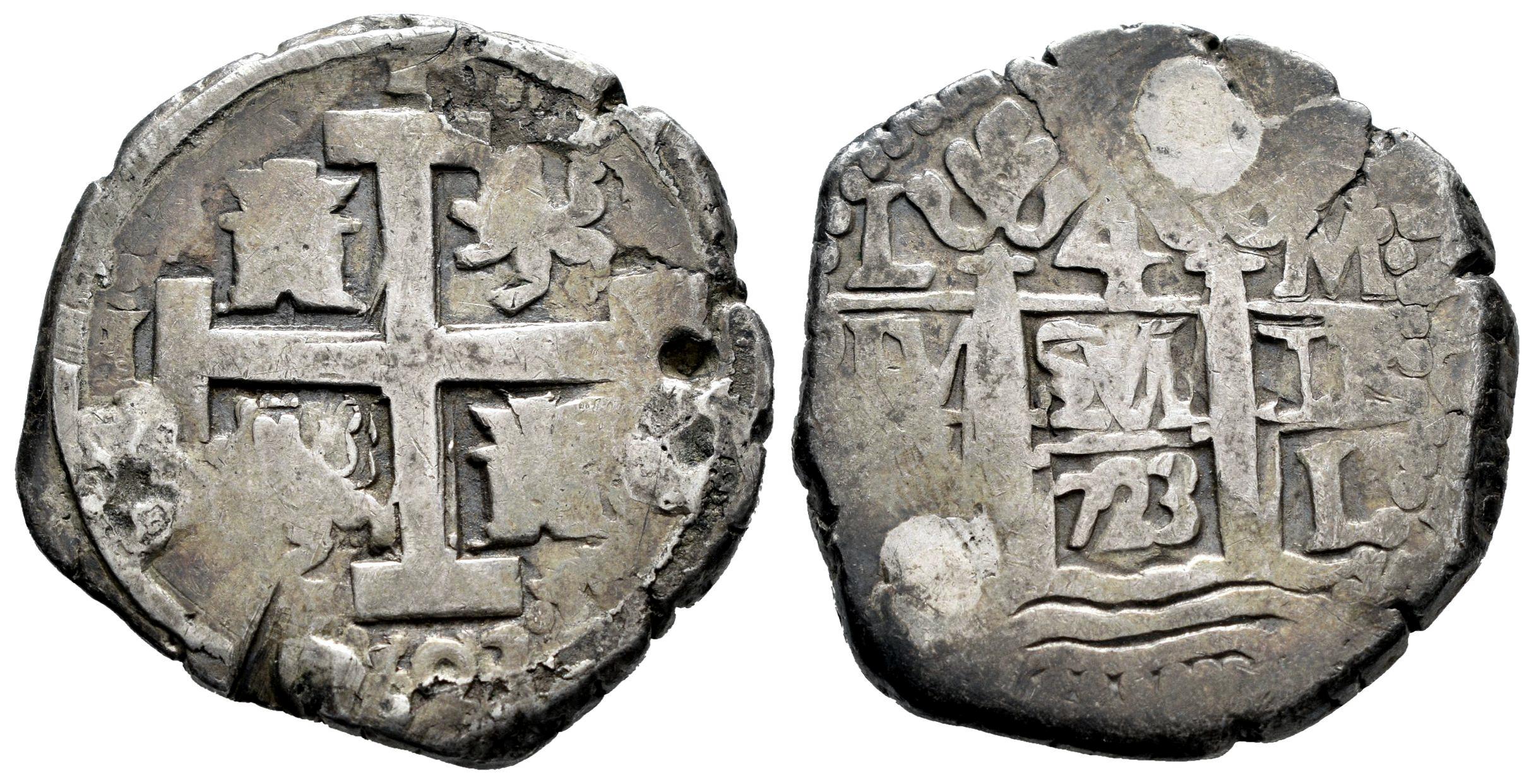 Felipe V (1700-1746). 4 reales. 1723. Lima. M. (Cal-1037). Ag. 12,58 g. Doble fecha. Dos agujeros tapados. Resto de soldadura circular en anverso. Escasa. MBC. Est...200,00.