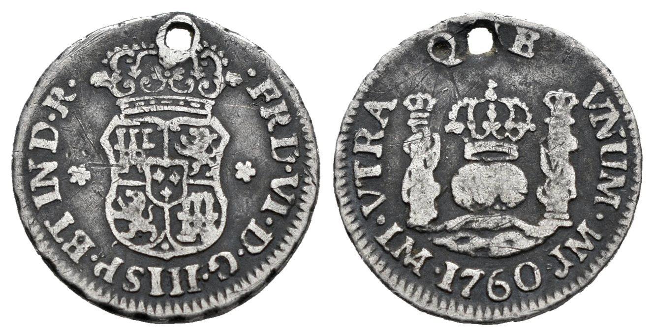 Fernando VI (1746-1759). 1/2 real. 1760. Lima. JM. (Cal-64). Ag. 1,66 g. Perforación. Pátina. MBC-. Est...40,00.