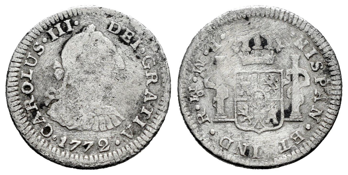 Carlos III (1759-1788). 1/2 real. 1772. México. FM. (Cal-192). Ag. 1,50 g. Ceca y ensayadores invertidos. Oxidaciones limpiadas. BC. Est...20,00.