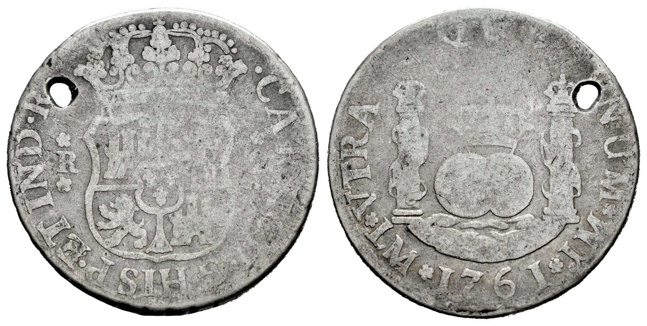 Carlos III (1759-1788). 2 reales. 1761. Lima. JM. (Cal-571). Ag. 6,33 g. Perforación. BC-. Est...35,00.