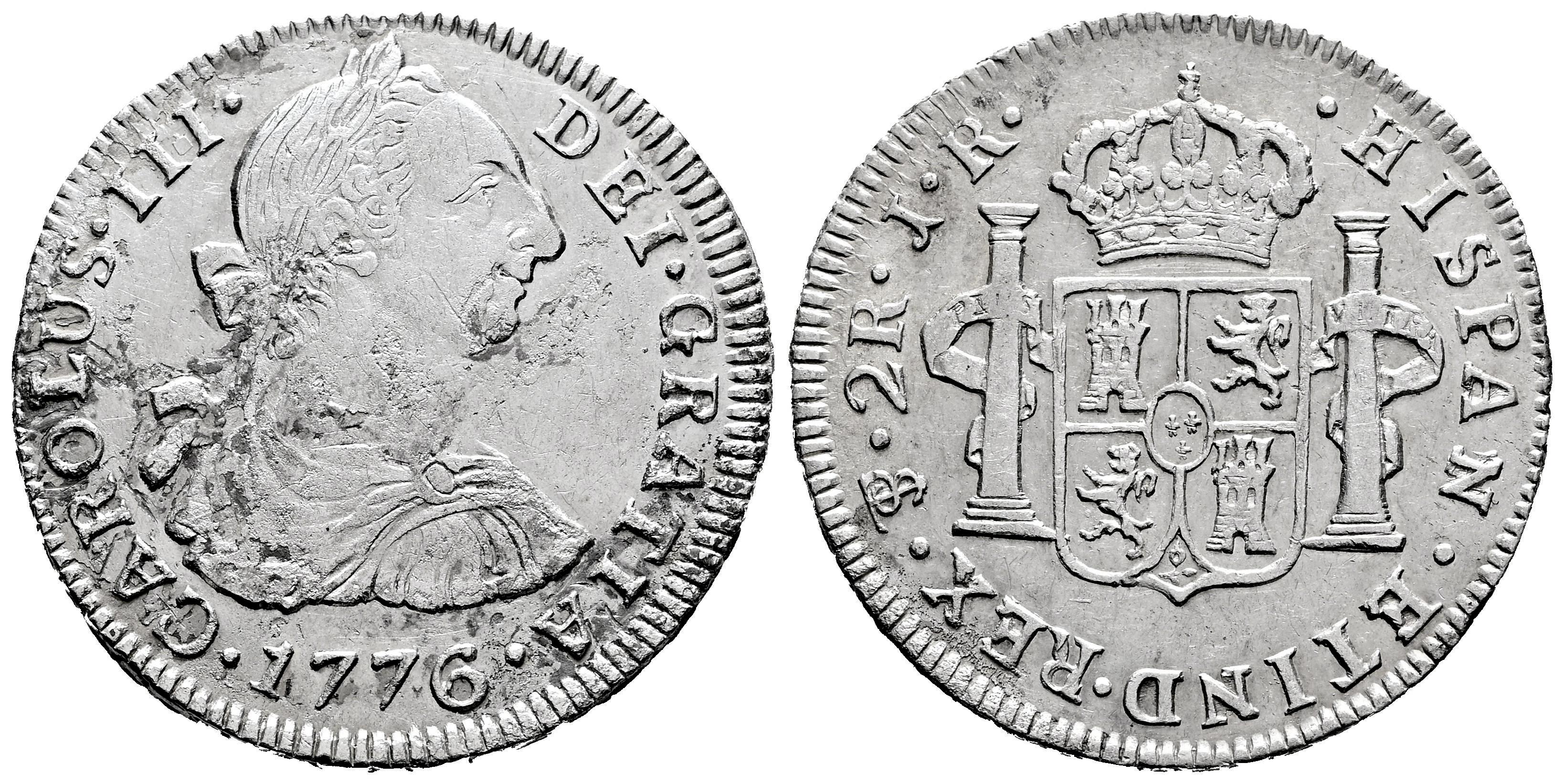 Carlos III (1759-1788). 2 reales. 1776. Potosí. JR. (Cal-717). Ag. 6,54 g. Oxidaciones. Ratos de brillo original. MBC+. Est...70,00.