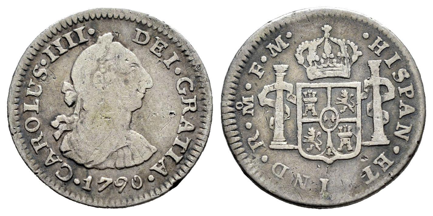 Carlos IV (1788-1808). 1/2 real. 1790. México. FM. (Cal-273). Ag. 1,57 g. Busto de Carlos III y ordinal del rey IIII. MBC-. Est...30,00.