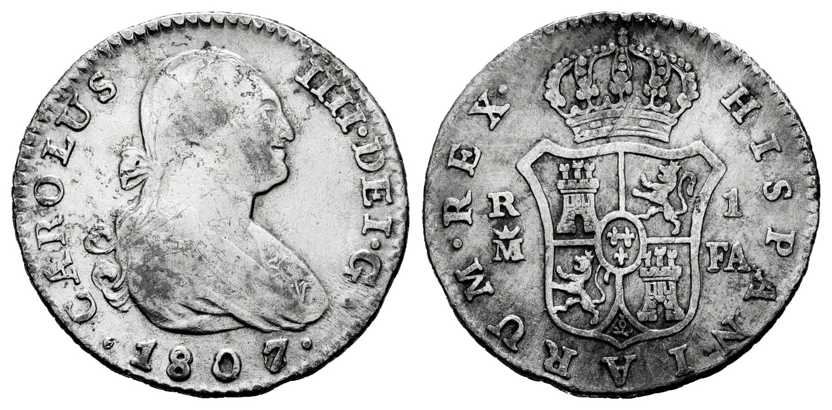 Carlos IV (1788-1808). 1 real. 1807/6. Madrid. FA. (Cal-423). Ag. 2,78 g. Sobrefecha. Limpiada. BC+. Est...30,00.
