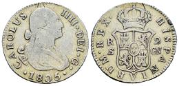 Carlos IV (1788-1808). 2 reales. 1805. Sevilla. CN. (Cal-725). Ag. 5,75 g. Limpiada. BC/BC+. Est...25,00.