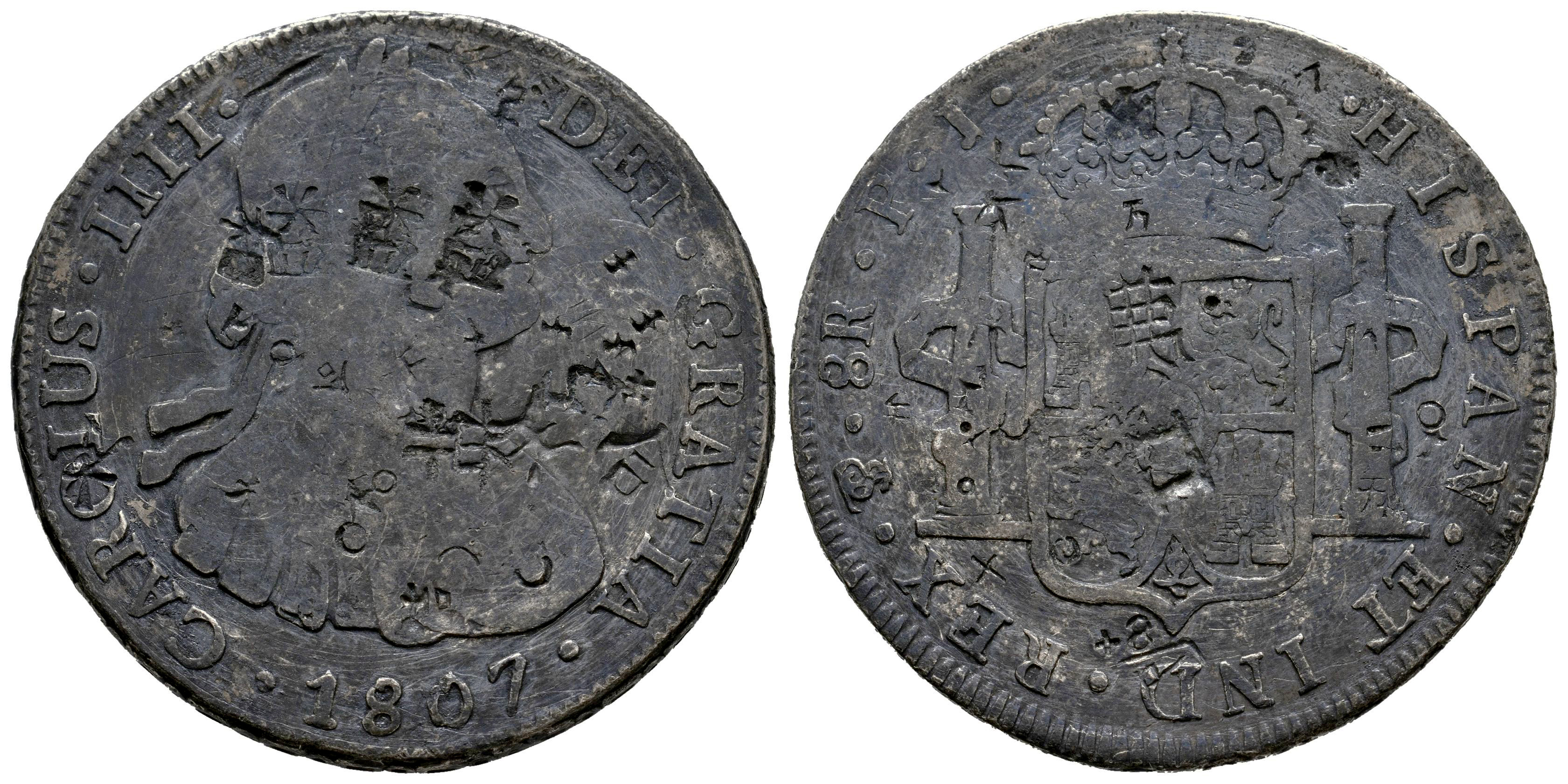 Carlos IV (1788-1808). 8 reales. 1807. Potosí. PJ. (Cal-1013). Ag. 26,71 g. Resellos orientales. Rayas. MBC-. Est...100,00.