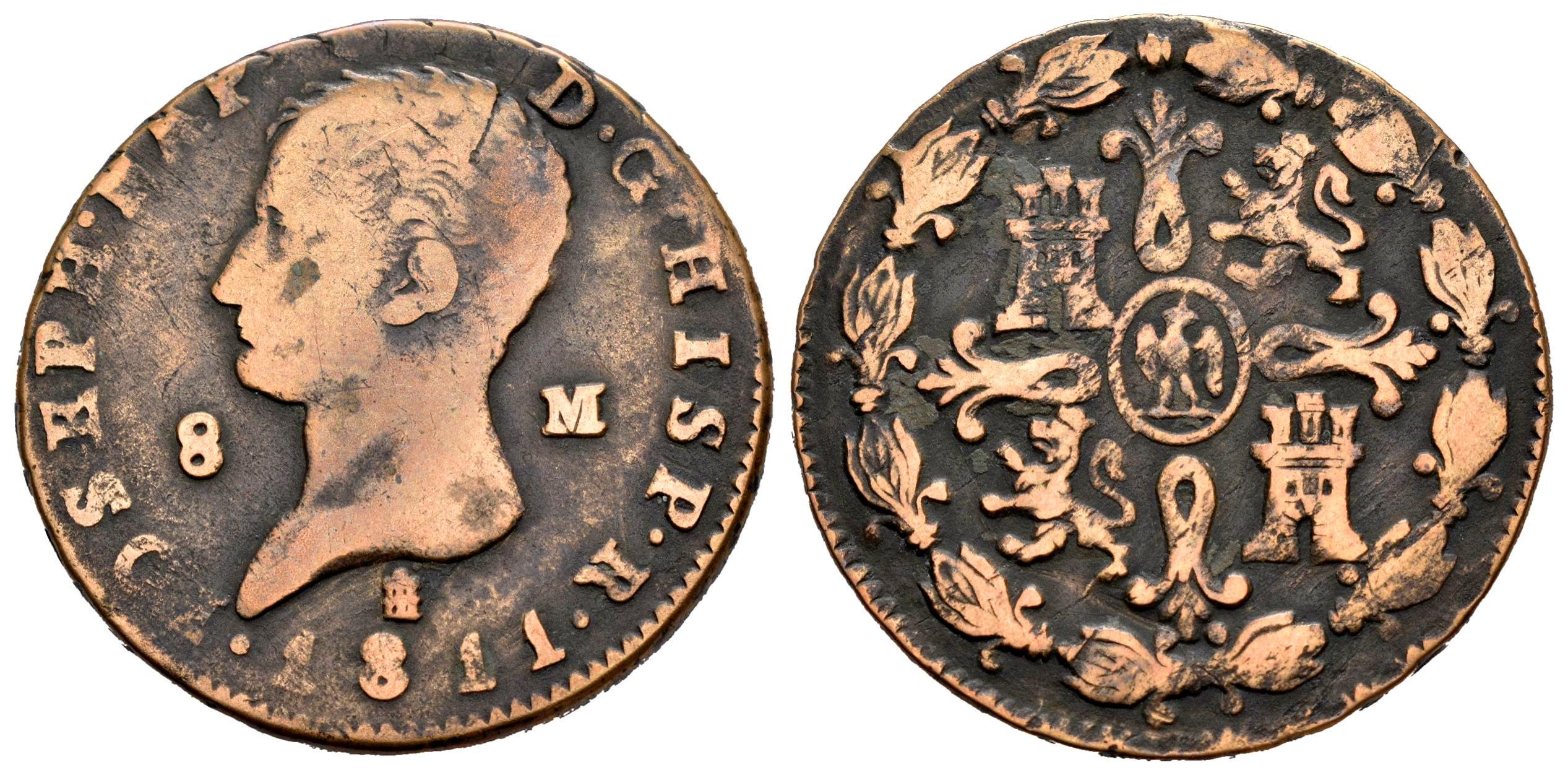 José Napoleón (1808-1814). 8 maravedís. 1811. Segovia. (Cal-2). Ae. 11,31 g. BC+. Est...35,00.