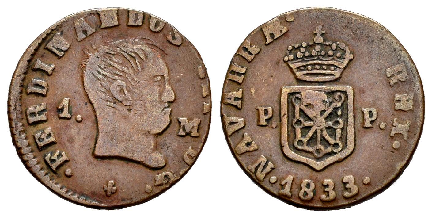 Fernando VII (1808-1833). 1 maravedí. 1833. Pamplona. (Cal-42). (Ros-4.11.31). Ae. 1,84 g. Busto desnudo. MBC-. Est...35,00.
