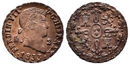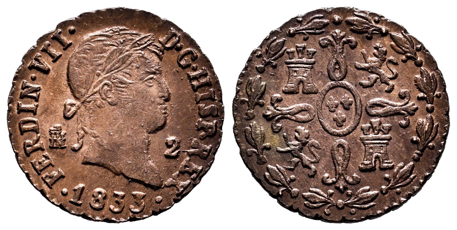 Fernando VII (1808-1833). 2 maravedís. 1833. Segovia. (Cal-157). Ae. 2,24 g. EBC. Est...35,00.